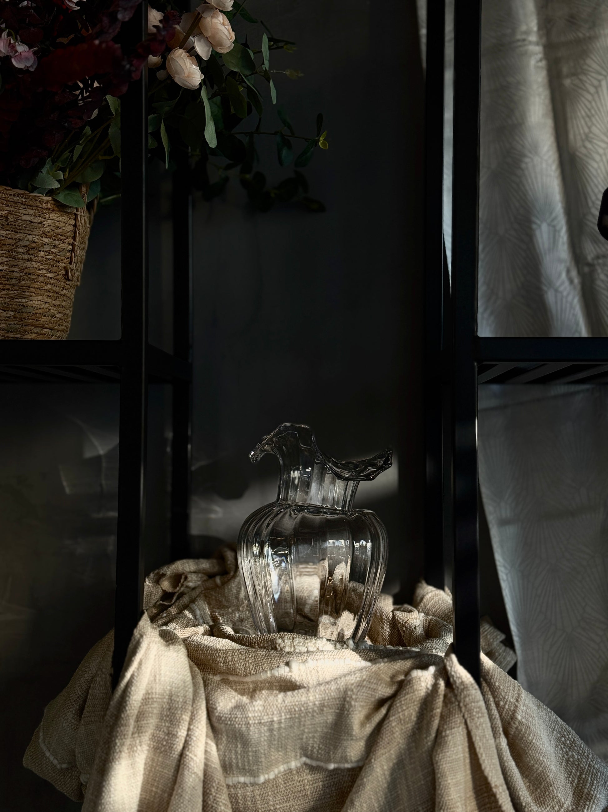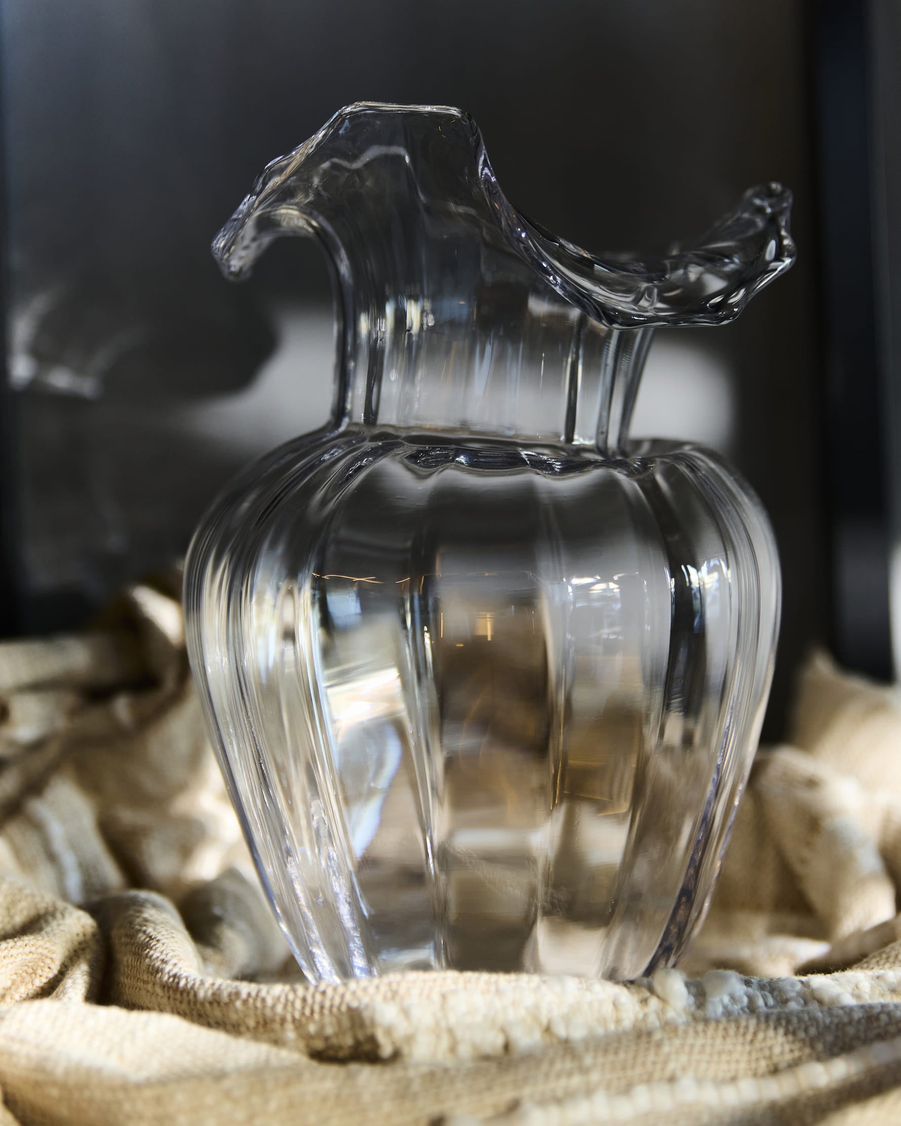 Clear glass vase with a fluid sculptural form and organically shaped rim. Light, airy design that captures movement and brings a modern elegance to floral arrangements.
