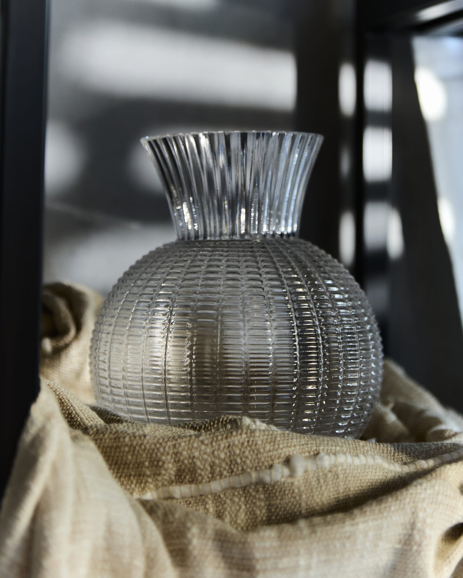 Clear glass vase with a textured spherical form and fluted neck. Light-reflecting accent that adds depth and elegance to floral arrangements.
